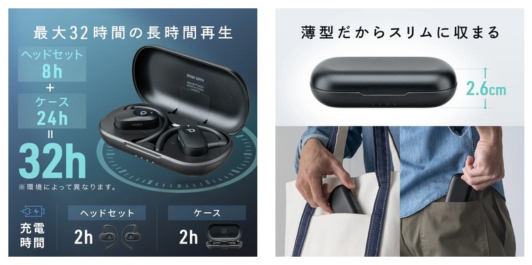 Bluetooth Ver.6.1対応で、安定したワイヤレス接続を実現。通信距離は最大約10m(理論値)で、ストレスのない使用感を提供する。イヤホン単体で最大約8時間、充電ケース併用で最大約32時間の再生が可能。薄型(約2.6cm)の充電ケースはポケットにもすっきり収まり、持ち運びにも便利だ。