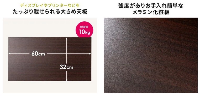 総耐荷重は約10kg。モニター台としてはもちろん、プリンタやスキャナーなどの周辺機器置き場としても活躍する。天板にはメラミン化粧板を採用し、傷や汚れに強い仕様。スチールフレームとの組み合わせで、安定感と耐久性を両立している。