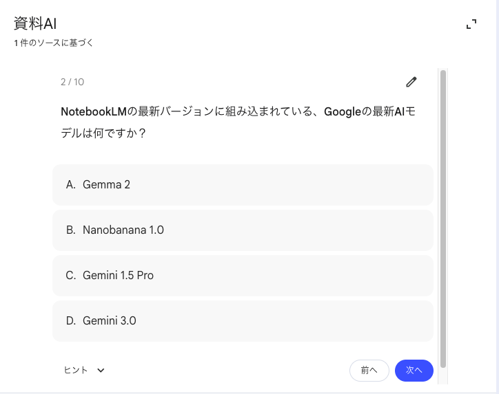 「フラッシュカード(単語帳)」や「クイズ(理解度テスト)」を自動生成する機能も見逃せない。読み込んだ資料をもとに重要なポイントをクイズにしてくれる。試験勉強やスキルアップを目指す読者にとって、強力な学習パートナーになってくれるのだ。