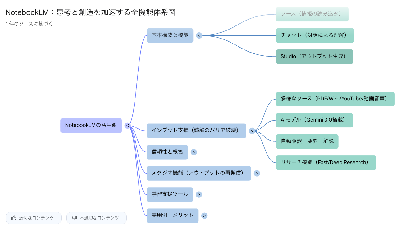 NotebookLMのマインドマップの特徴は、あまりマップで深掘りするのではなく、深い階層になるまえにキーワードの部分をクリックすると、元のチャット画面に戻り、そのキーワードを深掘りする質問をチャット画面に投げる仕掛けになっている。