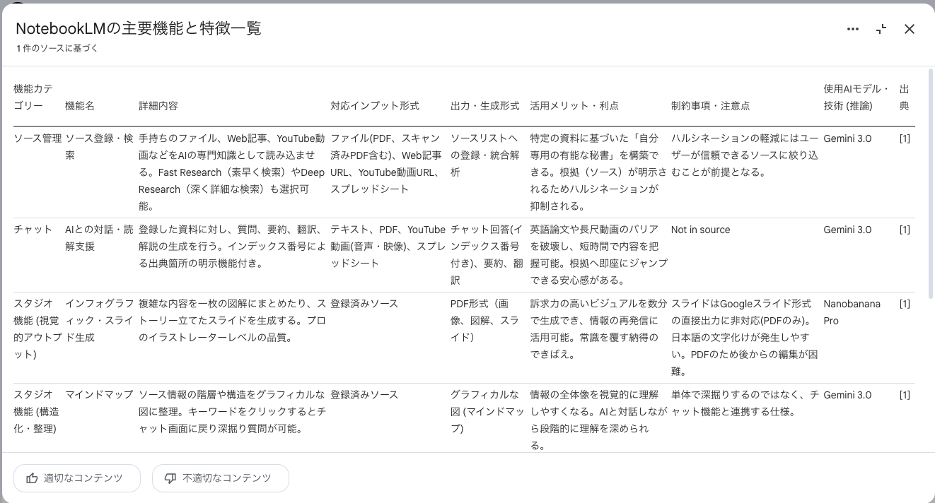 AIの回答には、必ずソース内のどの箇所を参照したかを示す「インデックス番号」が付与される。クリックすれば該当する資料のページや動画のチャプターへ即座にジャンプできる。AIが勝手に知識を捏造するのではなく、常に「あなたが渡した資料」に基づいて会話をしてくれる安心感は、ビジネスや研究の現場において最重要な事柄のひとつだ。