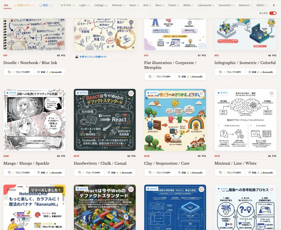 BananaNLで使える画像スタイルはとてもたくさん揃っており、サンプルを見て選ぶことができる。この画面は「BananaX」と呼ばれる画面で、NotebookLMを使う前段階で、あらかじめ気に入った画像スタイル(=候補)を選んでおく機能がある。