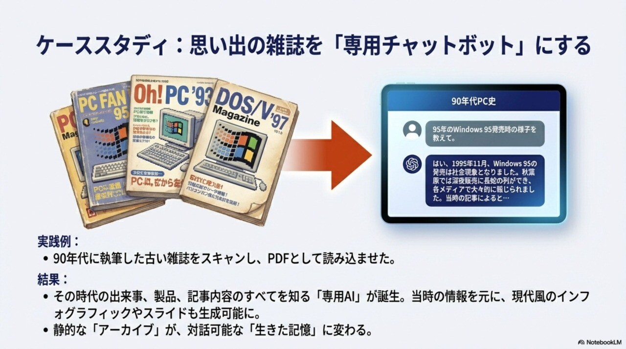 本稿をお読みいただいたあなたも、まずは手元にある、積み残したままのPDFや気になるYouTube動画を、NotebookLMのノートブックに放り込むところから始めてみてはいかがだろうか。昨日までのあなたの知的世界が、一瞬で広がる体験を約束する。