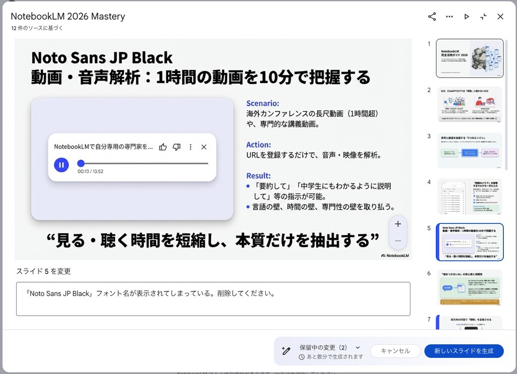 大変優秀なAIではあるが、各スライドの内容に修正を入れたい場面は多い。そこでスライドの内容を微修正する機能が追加された。