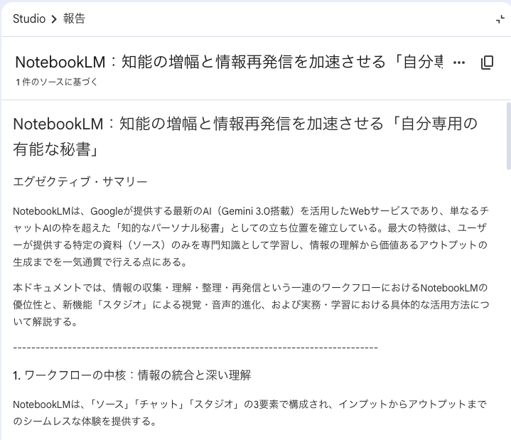 NotebookLMの魅力、ひとつめは情報の理解を強力に手助けしてくれることである。