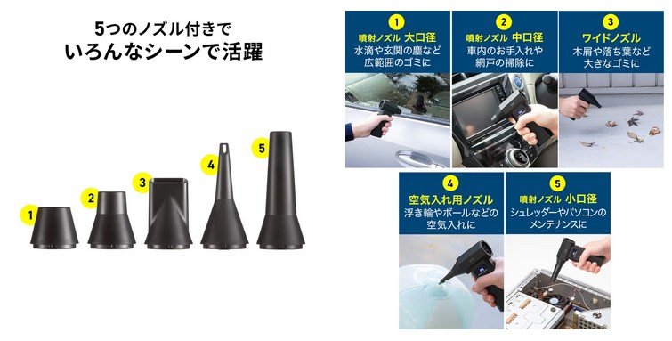 用途によって使い分けることのできる5種類のアタッチメントを付属している。キーボードの隙間、精密機械、エアコン、車内、窓のサッシ、サーキュレーターなどあらゆる場所で使える。