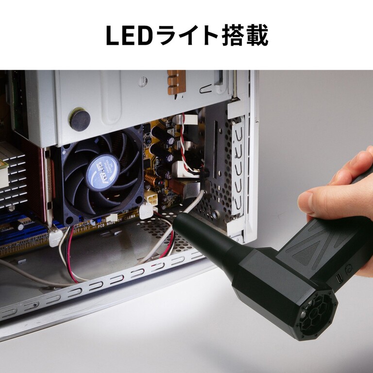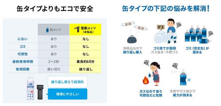 通常のエアダスターに比べ、繰り返しの購入が必要なく、ガスの匂い、缶の処理、火気による危険がない。