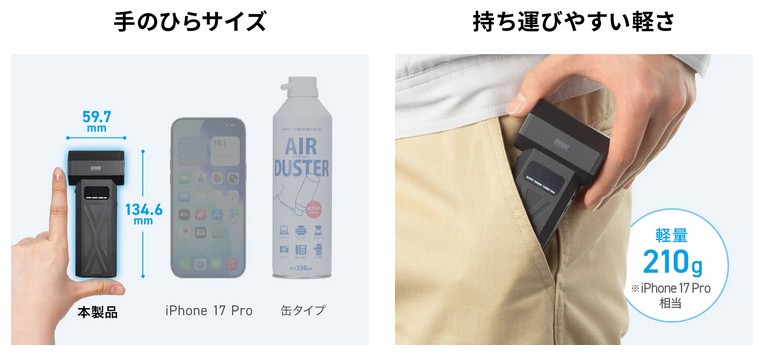 ポケットに入れて外出先への持ち運びが簡単な手のひらサイズ。軽くて持ちやすく、長時間使っても疲れにくい設計だ。