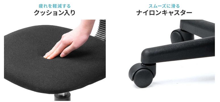 座面はクッション入りで、長時間の作業でもお尻への当たりをやわらげて疲れを軽減する。さらにナイロンキャスターが床の上をスムーズに転がるので、立ち座りや向き替え、掃除やレイアウト変更もストレスなし。シンプル構造で導入しやすく、コスパ重視の増設にもぴったりだ。