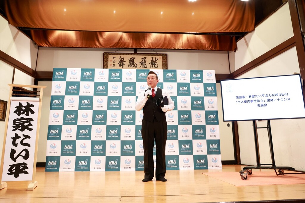 国土交通省は2026年2月25日(水)に「バス車内事故防止」啓発アナウンス発表会を、木馬亭(東京浅草)にて開催した。当日は、アナウンスを担当した落語家・林家たい平が登壇し、実際の車内アナウンスが披露された。