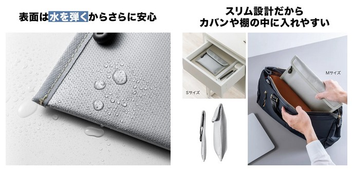 表面には水を弾く加工を施し、軽度の水濡れから収納物を守る。さらにスリム設計のため、カバンや引き出しにすっきり収納可能。安全性だけでなく、使いやすさにもこだわりました。ビジネスシーンにもなじむシンプルなデザインだ。