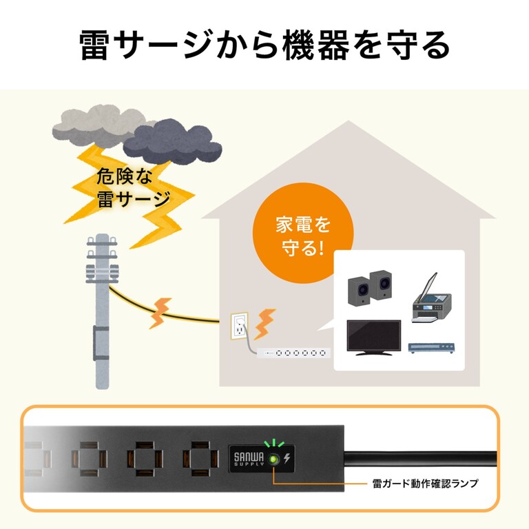 内蔵されたサージ吸収素子(バリスタ)が雷サージを吸収し、接続機器を守る。