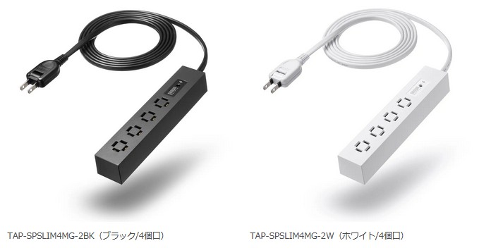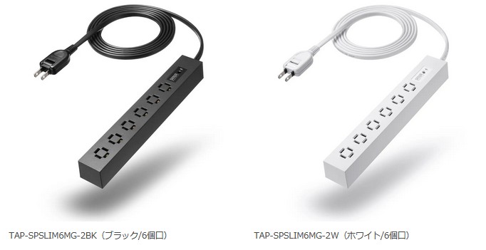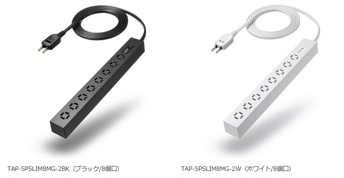 カラーはブラックとホワイトの2色展開で、差込口数は4個口「TAP-SPSLIM4MG-2BK/W」、6個口「TAP-SPSLIM6MG-2BK/W」、8個口「TAP-SPSLIM8MG-2BK/W」から選択できる。