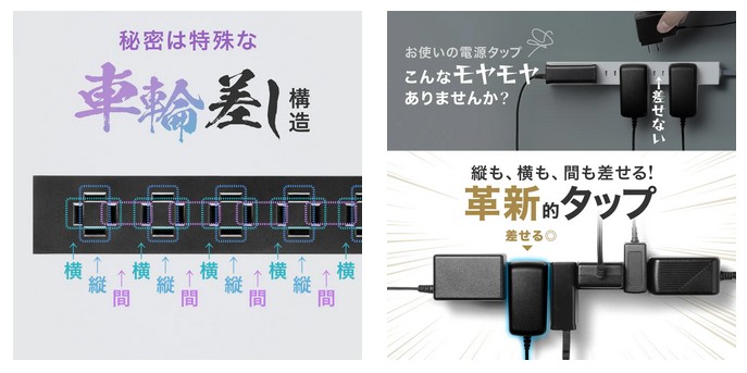 縦横どちらの向きでもプラグを差込める独自設計で、間のスペースも有効活用できる自由度が高いタップ。