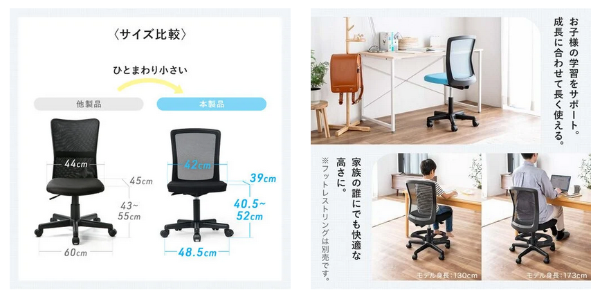 家庭のワークスペースや学習机などにも設置しやすいコンパクトサイズのオフィスチェア。幅約48.5cmの省スペース設計で、限られた空間でも快適に使用できる。軽量設計のため移動もしやすく、日常のさまざまなシーンで活躍する。