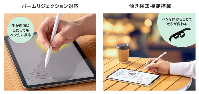 手の接触による誤作動を防ぐパームリジェクション機能と、ペンの角度で線の太さを変えられる傾き検知機能によって、タブレット利用でもいつものノートに近い感覚で文字を書くことができる。※アプリによっては、パームリジェクション機能がご使用できない場合がある。