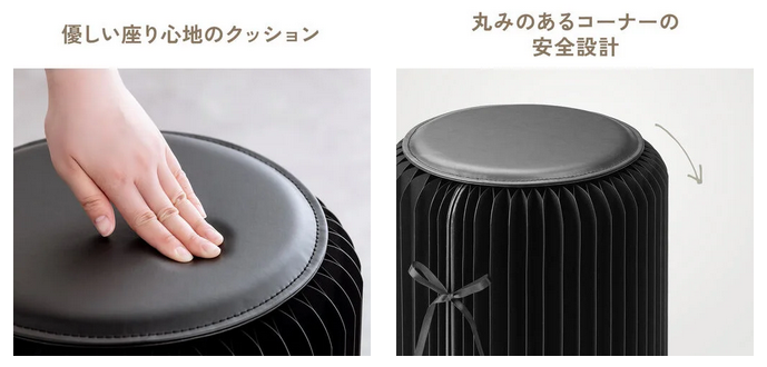 座面にはクッションを採用し、長時間座っても疲れにくい快適な座り心地を実現した。やさしい丸みを帯びたラウンドデザインは、インテリアにもなじみやすく、角がないため安心して使用できる。シンプルながら機能性を追求したデザインで、自宅・オフィス・イベントスペースなどさまざまなシーンにマッチする。
