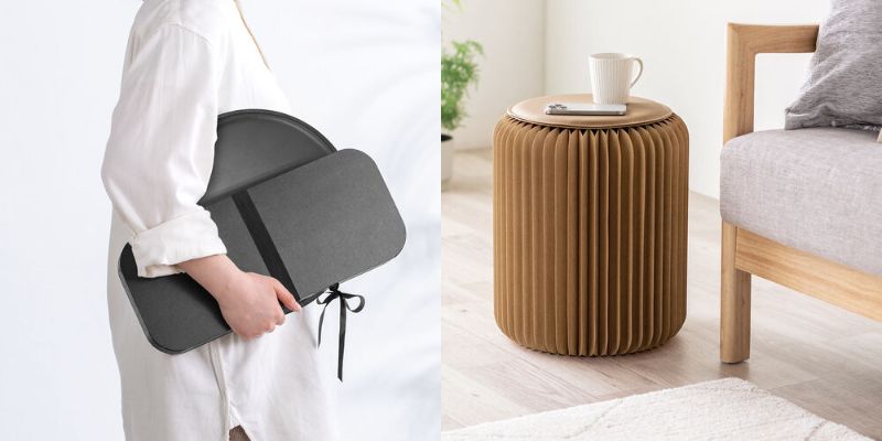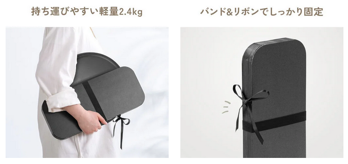 本体重量は約2.4kgと軽量設計で、女性でも簡単に持ち運びできる。紙素材を活用した環境配慮型デザインを採用しており、サステナブルなライフスタイルにも貢献する。実用性と環境への配慮を両立した、新しい家具の選択肢として注目の製品だ。