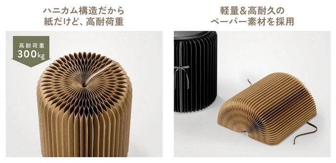 紙素材を採用しながらも、内部にハニカム構造を取り入れることで高い強度を実現した。耐荷重は約300kgと非常に頑丈で、大人でも安心して座ることができる。軽量と高耐久を両立した設計により、見た目以上の安定感を提供。従来の紙製家具のイメージを覆す、新しい構造デザインだ。