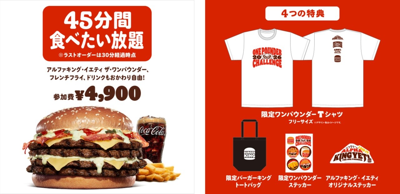 毎回チケット即完売の人気イベント『ワンパウンダーチャレンジ』の2026年第1弾を、好評につき過去最多の全国70店舗にて開催する。今回は、直火焼きの100%ビーフパティ4枚、まろやかな味わいのゴーダチーズ4枚と「ホワイトチーズソース」に、スモーキーなベーコン4枚とケチャップを加えた『アルファキング・イエティ ザ・ワンパウンダー』(総カロリー1,713kcal*1 総重量543g*2)が食べたい放題で楽しめる。