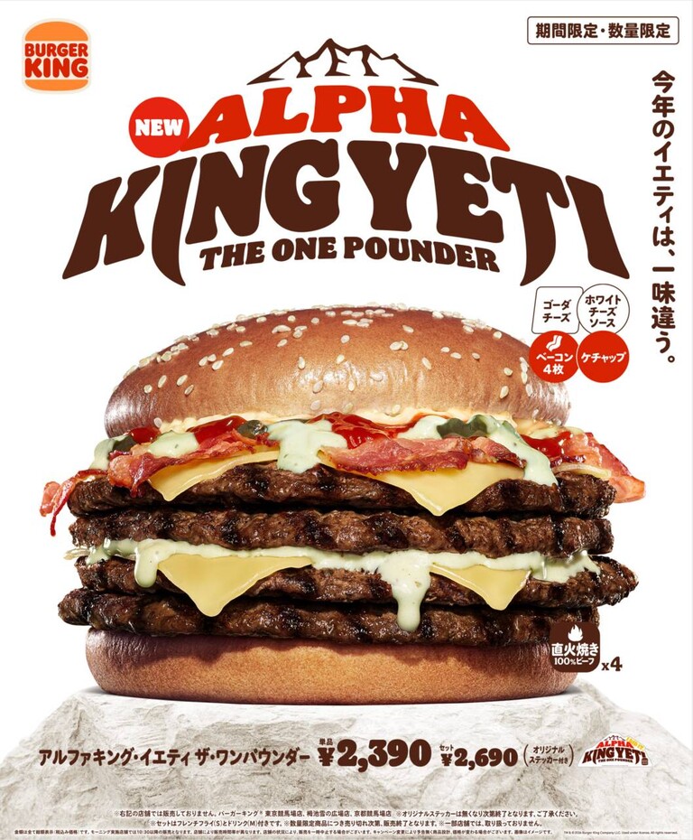 『チーズバーガー好きの皆様、大型バーガー好きの皆様、“ワンパウンダーシリーズ”好きの皆様、バーガーキングファンの皆様も、総カロリー1,713*1、総重量543g*2の、ビーフパティ4枚、ゴーダチーズ4枚、濃厚な「ホワイトチーズソース」に、ベーコンとケチャップを加えた『アルファキング・イエティ ザ・ワンパウンダー』をぜひこの機会に存分にお楽しみください。』