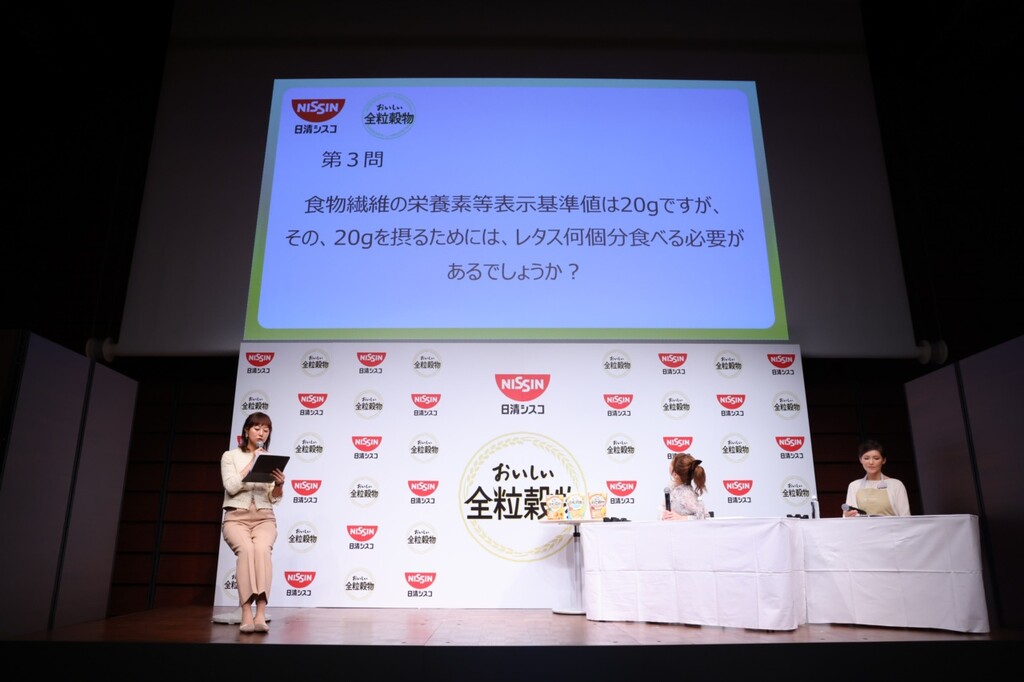 トークショーでは、タレントの辻希美さんと、料理研究家で栄養管理士の関口絢子さんが登壇し、食物繊維クイズも行われた。