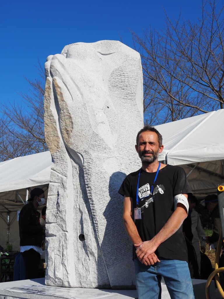 イヴァン・ストヤノフ氏はブルガリアを代表する石彫作家の一人。2024年10月、茨城県桜川市に約1ヵ月滞在し、茨城県産の「やさとみかげ」を用いて本作品を制作した。「やさとみかげ」は国際地質科学連合(IUGS)よりヘリテージストーン(世界天然石材遺産)に認定された筑波山塊の花崗岩で、日本を代表する石材の一つ。