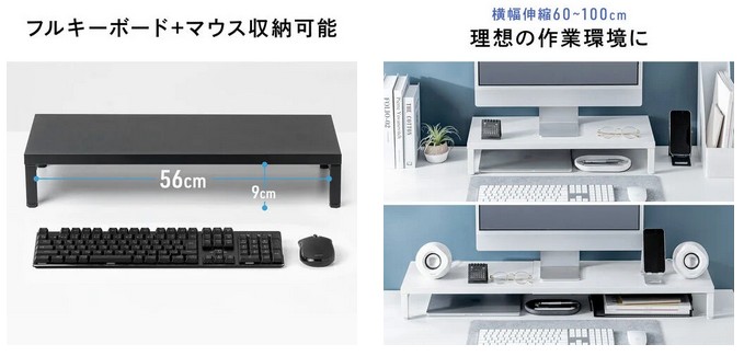 フルキーボードとマウスを収納できる幅60cmタイプの「100-MR217W」と、スライド天板構造により幅60~100cmまで調整できる「100-MR218W」の2サイズをラインアップ。デスクサイズや設置スペースに合わせて、最適な幅のモニター台を選ぶことができる。コンパクトなデスクから広いワークスペースまで対応できるため、オフィスはもちろん在宅ワーク環境にもおすすめだ。