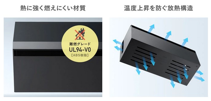 耐熱素材を使用し、さらに熱がこもりにくい構造を採用。底面には放熱用スリットを設けることで、電源タップ使用時の発熱リスクを軽減する。安全性を重視した設計により、家庭でもオフィスでも安心して使用可能。見た目だけでなく“安全”も整える新しい選択肢だ。