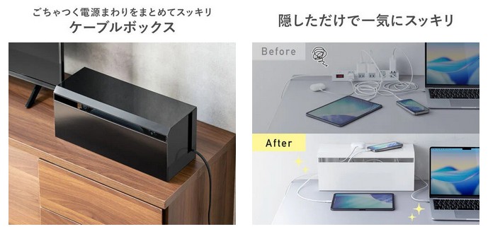 サンワサプライ株式会社が運営している直販サイト『サンワダイレクト』は、電源タップやケーブル、ゲーム機本体をスマートに収納できるケーブルボックス「200-CB100BK(ブラック)」と「200-CB100W(ホワイト)」を発売した。