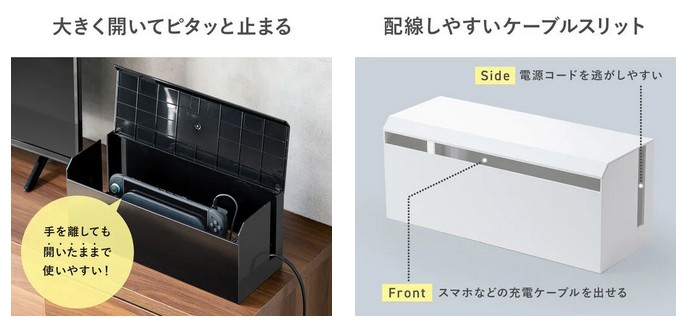 ボックスは開閉式の蓋を採用しており、内部の配線整理や掃除も簡単に行える。ケーブルの追加や配置変更もスムーズに対応できるため、環境の変化にも柔軟に対応。日々の使いやすさにこだわった設計で、長く快適に使用できる。