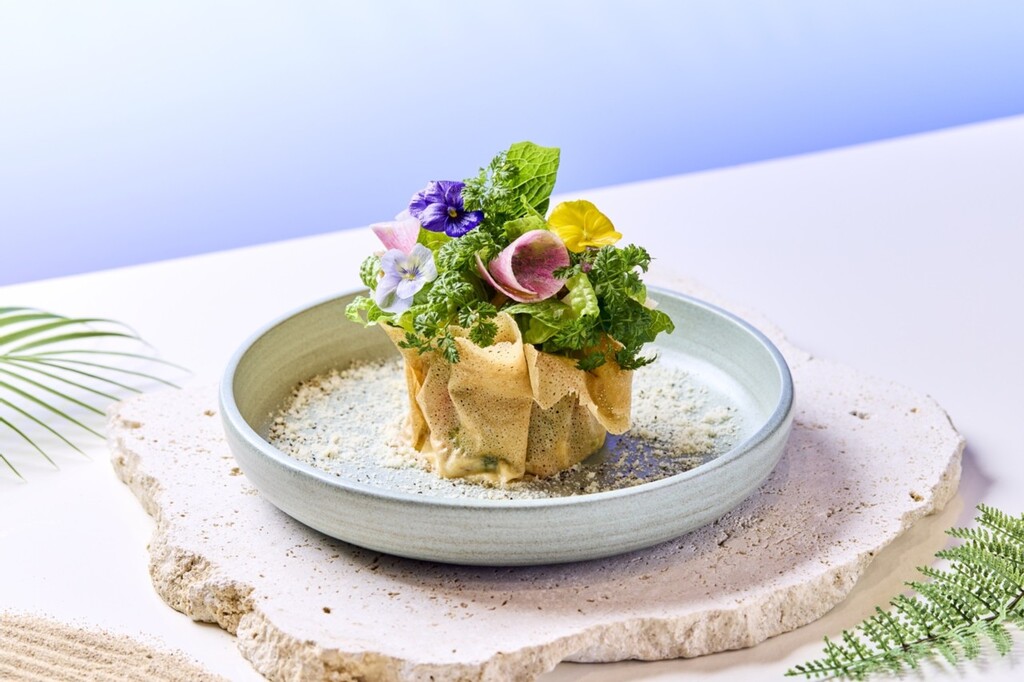 ジャングリア沖縄を象徴するJUNGLIA ツリーをイメージし、タンパク質とミネラルいっぱいでパワーをチャージ。器を崩して、アンチョビとチーズの効いたドレッシングで食べられる。