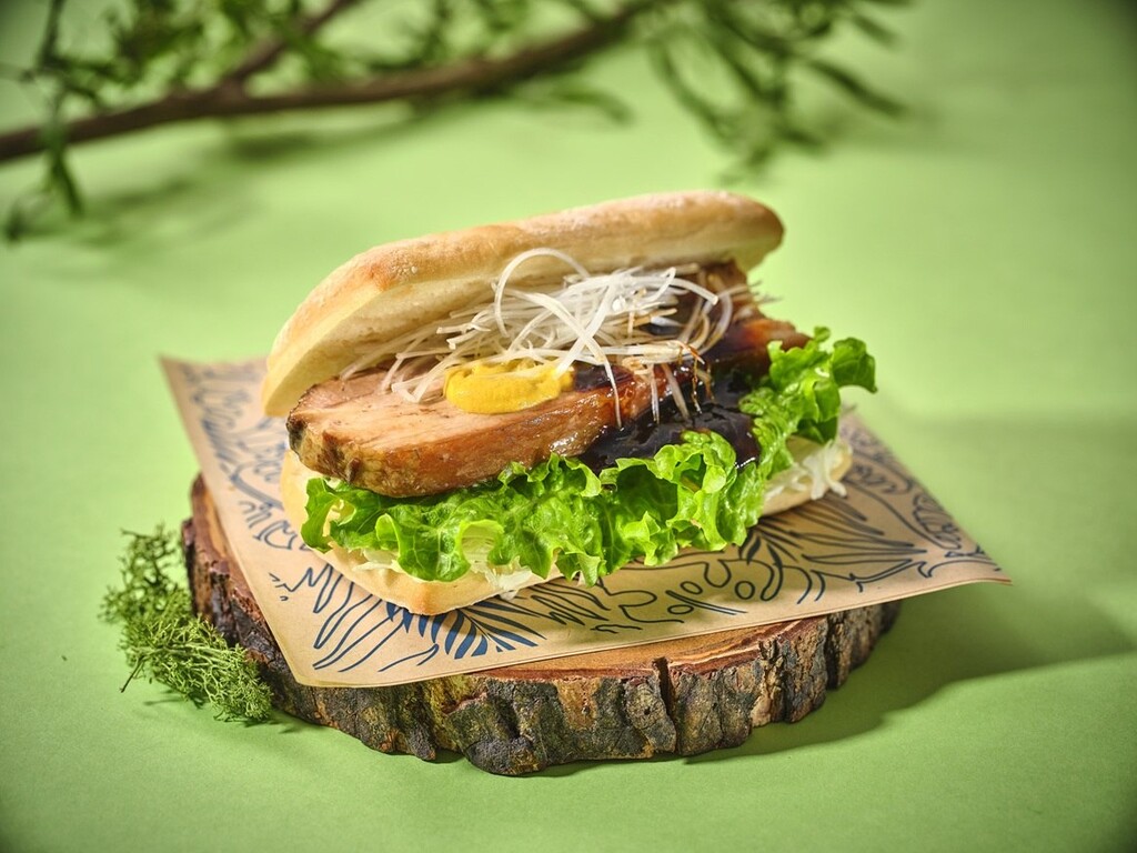 紅イモを食べて育ったやわらかく甘みのある紅豚をとろとろになるまで泡盛で仕込み、食べ応えのある角煮サンドに仕立てた。