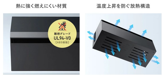 本製品は自己消化性に優れたUL94-V0グレードの難燃ABS樹脂を採用。さらに、底面のスリット構造により熱がこもりにくく、安全性を高めている。電源タップを収納する製品として重要な“安心して使える”性能をしっかり備えている。