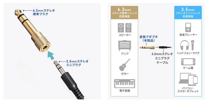 ■ミニプラグを標準プラグに変換できる3.5mm→6.3mm変換アダプタ