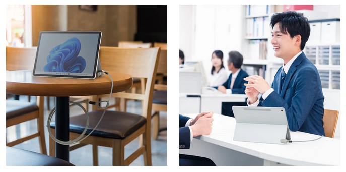ワイヤーをテーブルの脚や柱などに、しっかりと巻きつけることで盗難の防止になる。公共の場でも、安心して使用できる。