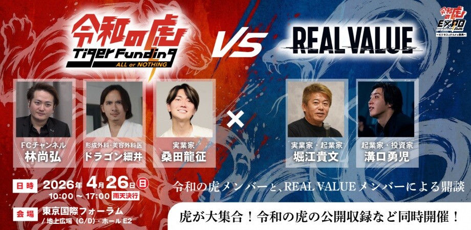 投資バラエティ番組「令和の虎CHANNEL」は、2026年4月26日(日)に東京国際フォーラムにて、『令和の虎EXPO All or Nothing 2026~ビジネスとグルメの祭典~』を開催する。