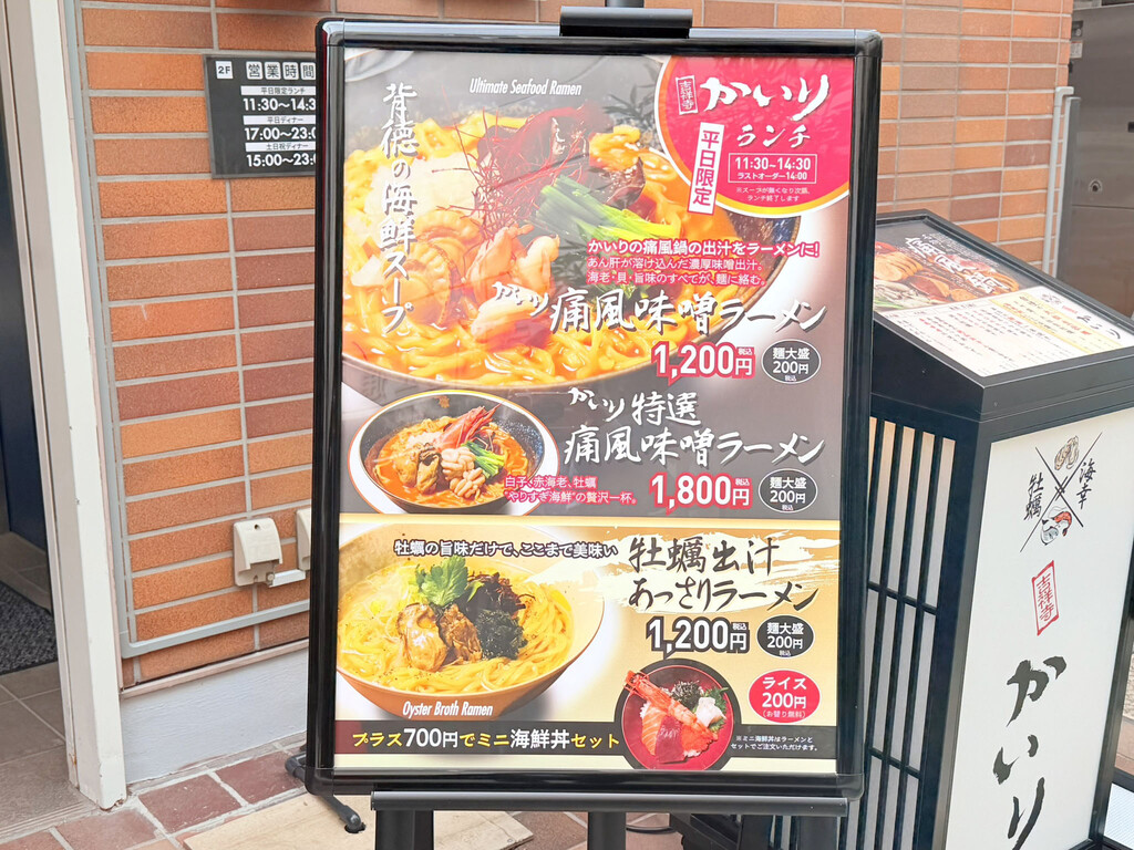 「かいり 特選 痛風味噌ラーメン」と「ミニ海鮮丼」、そして「牡蠣出汁 あっさりラーメン」を実食した。