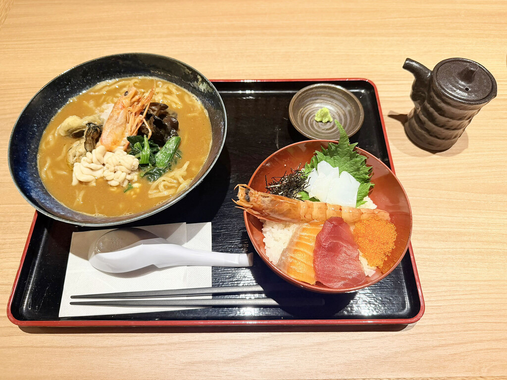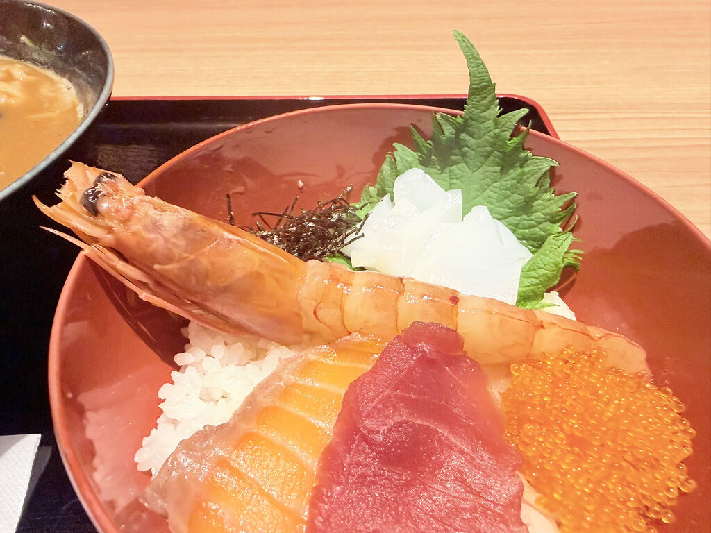 「ミニ海鮮丼」は、コンパクトな器ながら、まぐろ、サーモン、甘えびといった具材がバランスよく盛り付けられ、食欲をそそる彩りだ。ネタの鮮度も良く、美味しくいただいた。