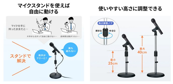 マイクスタンドがあれば、話しながら両手が使えるので、マイクを手に持ったままの不便さや腕のだるさを解消できる。25~40cmまでの高さ調節が可能だ。