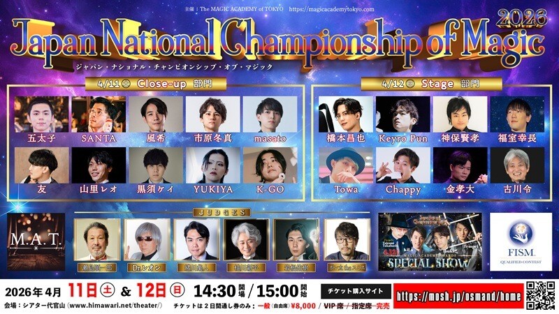 「The MAGIC ACADEMY of TOKYO」は、真の日本一のマジシャンを決める頂上決戦の大会として毎年注目を集めている『Japan National Championship of Magic 2026』(以下、JNCM2026)を、今年は4月11日(土)のクロースアップ部門と4月12日(日)のステージ部門が2日間に渡って開催される。