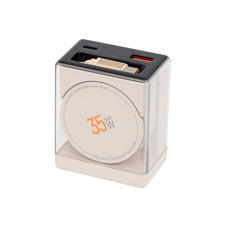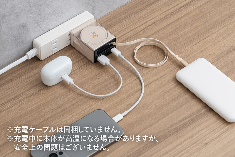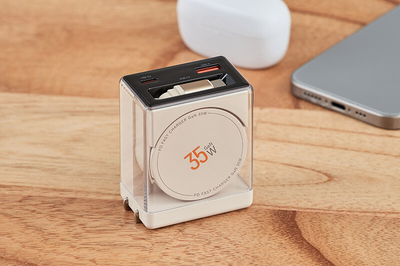 GaN(窒化ガリウム)を採用し、コンパクトながらハイパワー充電が可能な急速充電器。USB Type-Cポートを1つとUSB-Aポートを1つ、USB Type-Cコードを1つの計3つを搭載。小型で軽量であることに加え、USB Power Delivery(パワーデリバリー)とQuick Charge(クイックチャージ)に対応しており、ノートパソコンやスマートフォン、タブレットなどのデバイスに対し高速充電が可能だ。※本製品のUSB Power Delivery最大出力は35W