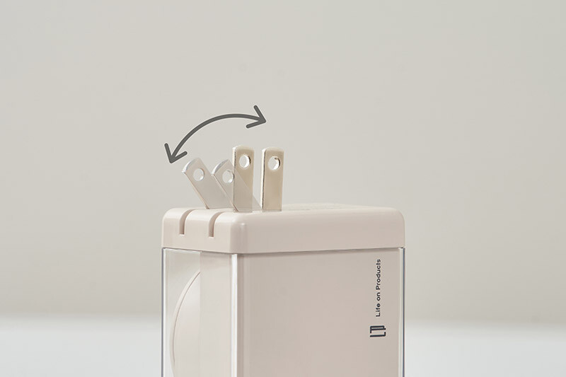 折りたたみ式のスイングプラグを採用し、持ち運び時にプラグや他の荷物を傷つけにくくする。