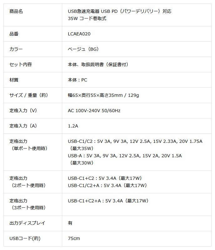 「USB急速充電器 USB PD(パワーデリバリー)対応 35W コード巻取式」LCAEA020