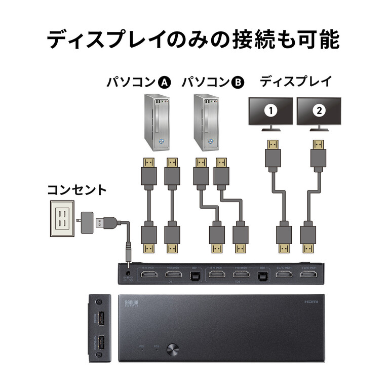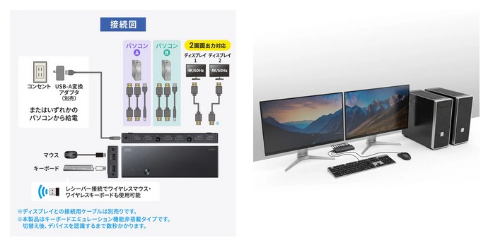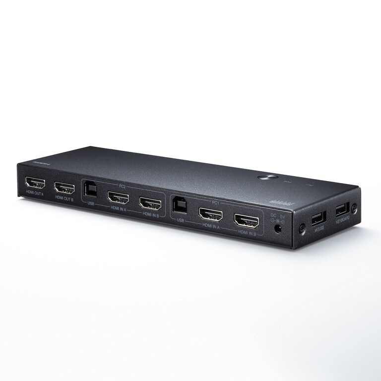 2台のパソコンで、1組のHDMIディスプレイ×2・USBキーボード・USBマウスを切替えて使用できる。