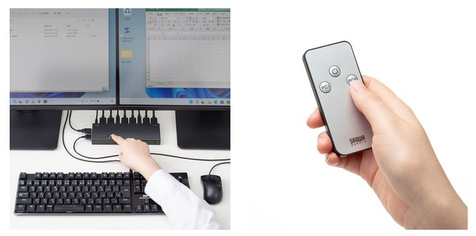 本体上面のスイッチを押すだけで、簡単に切替えられる。離れた場所から操作できる便利なリモコン付きだ。※ホットキーによる切替えには対応していない。