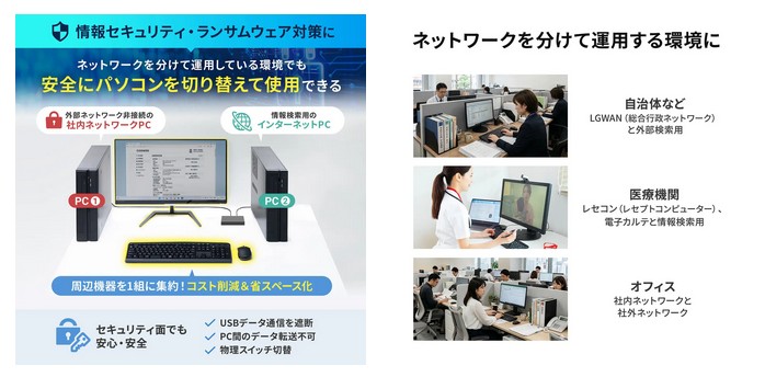 また、インターネット用パソコンと業務用パソコンなど、ネットワークを分けて運用している環境でも、パソコン切替器ならパソコンを物理的に切り替えて安全に操作可能だ。情報セキュリティ・ランサムウェア対策として自治体や医療機関、企業などへの導入もおすすめだ。