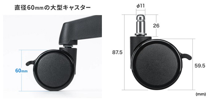 フローリングやPタイル、コンクリートなどの硬い床を傷つけにくく、静音性も高いウレタン巻きの双輪キャスターだ。