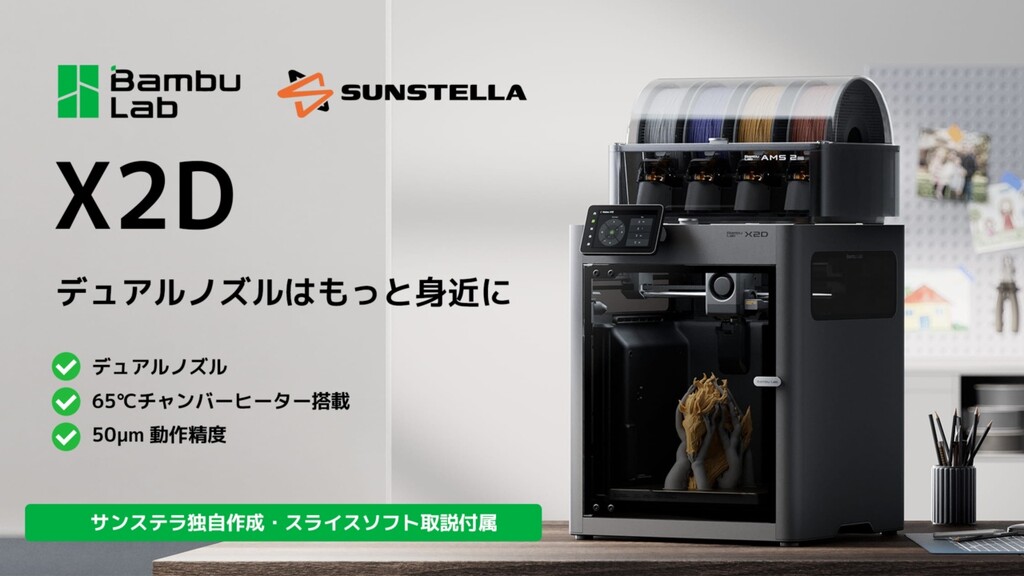 株式会社サンステラは、Bambu Lab製の最新デュアルノズル3Dプリンター「X2D」の国内展開を開始した。本製品は20万円未満ながらも、50μmの動作制度と、デュアルノズルを搭載し、マルチカラー・サポート別材料化・マルチマテリアル造形の高速化を実現。これまでにない造形体験と生産性を提供する。また65℃のアクティブチャンバーを搭載し、エンジニアリングプラスチックの安定造形も可能になった。