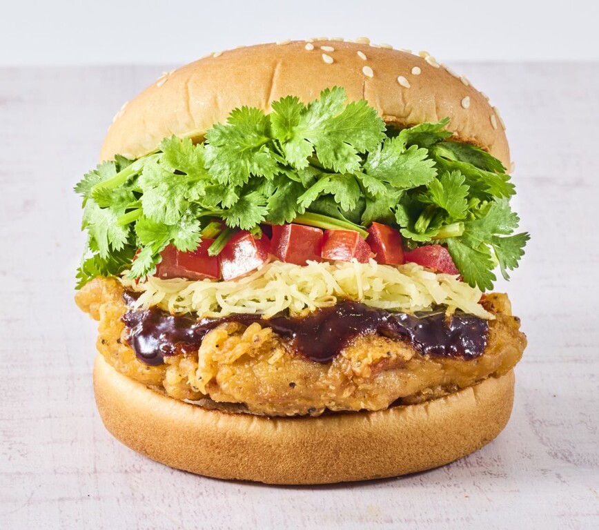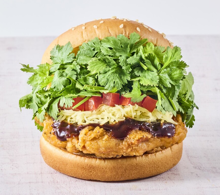 新作バーガー部門で1位を獲得した「パクチーチキンバーガー カオマンガイ」は、タイの屋台料理として親しまれるカオマンガイをバーガースタイルで表現した一品だ。店内調理のジューシーなクリスピーチキンに、甜麺醤をベースにコチュジャン、オイスターソースを合わせたオリジナルソースを使用した。